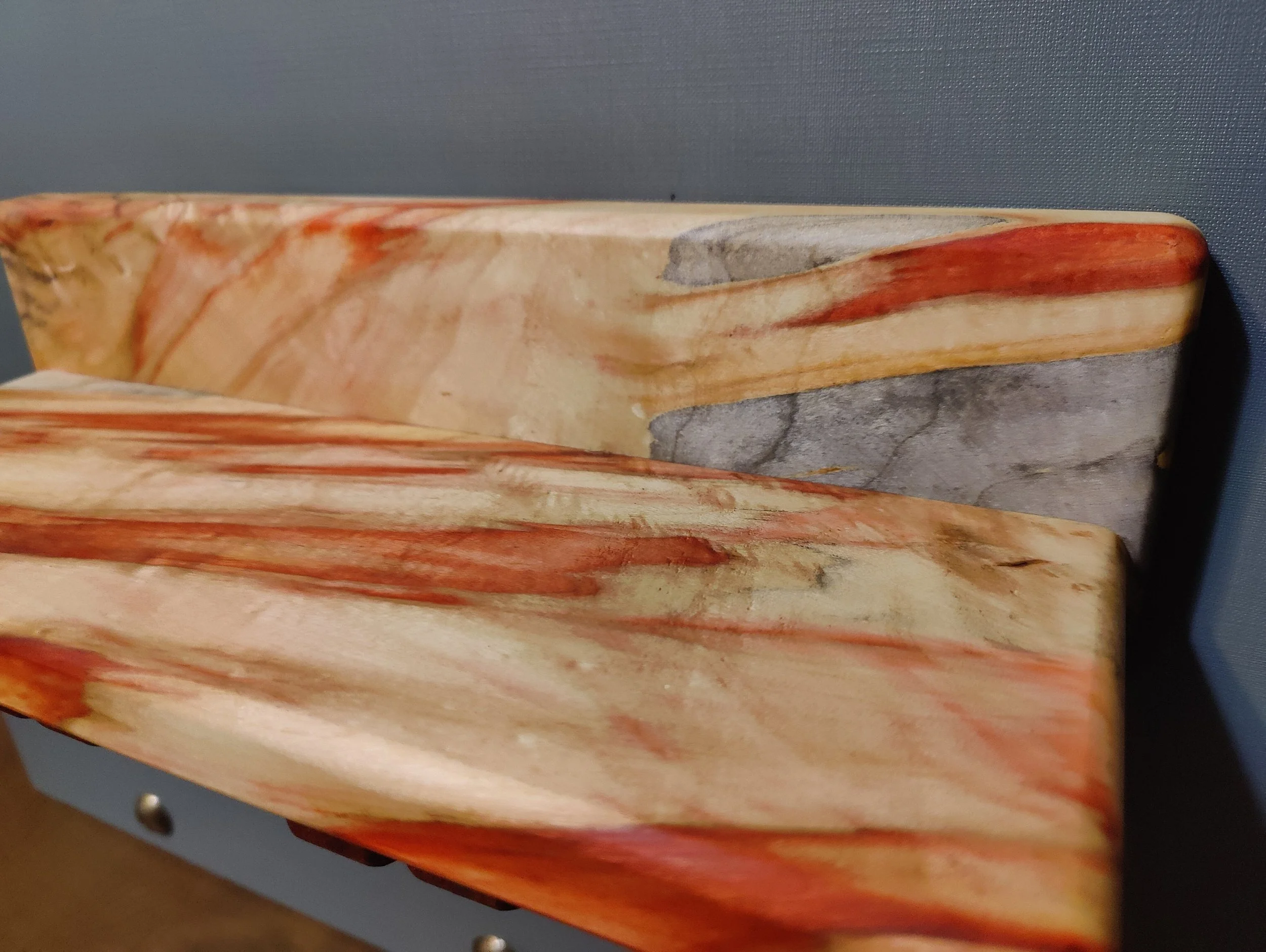 The wood has a hand rubbed finish with Odie's Oil and Odie's Wood Butter to protect the wood, make it pop, and still feel like wood not plastic. The back of the shelf has two t-slots cut in to make mounting to your wall quick and easy (please mount into a stud or using the correct hardware).